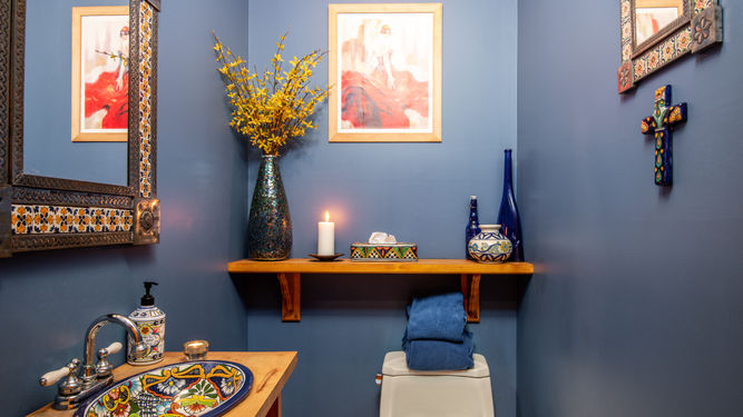 Back on the ground floor, you’ll find three more Bedrooms, another full Bathroom, and a charming Half-Bath with Talvera sink. Currently, one of the bedrooms is being used as a Media Room - and it has its own entrance to the front patios.